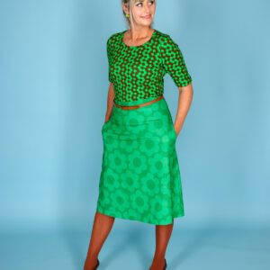 Lang nederdel med flotte rå detaljer som metal trykknapper og lommer i sidesøm oven på påsatte lommer. Modellen er i let A-facon med fast linning og bæltestropper samt slids bagpå.