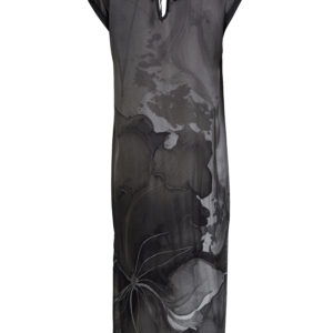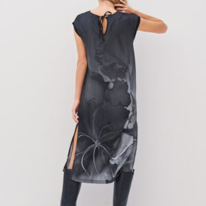 Kjolen har en løs, lige pasform med drop shoulder og en elegant halsudskæring med kantebånd som bindes i ryggen. I begge sider er der en slids på ca. 33 cm. Den har en blød silhuet og en let struktur som kan styles både til en festlig aften eller til en hverdag. Hvis du fx. sætter et læderbælte og en jeansjakke til, får du et råt udtryk, men du kan også style med jakke eller blazer for et mere formelt udtryk.