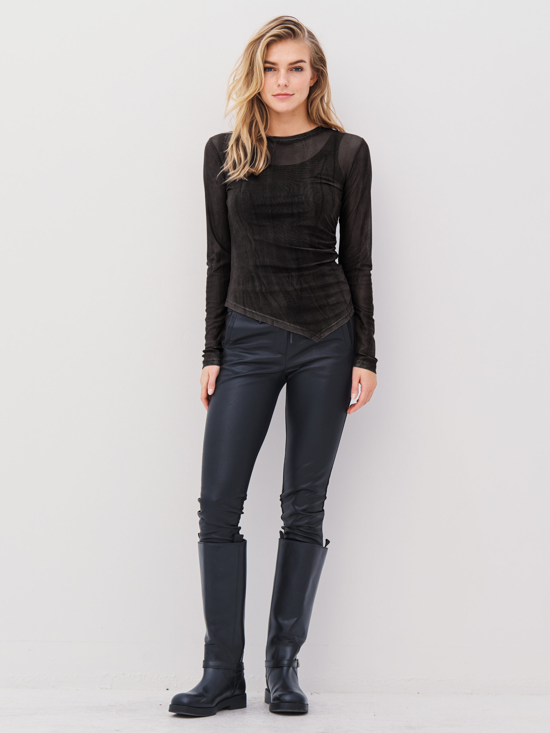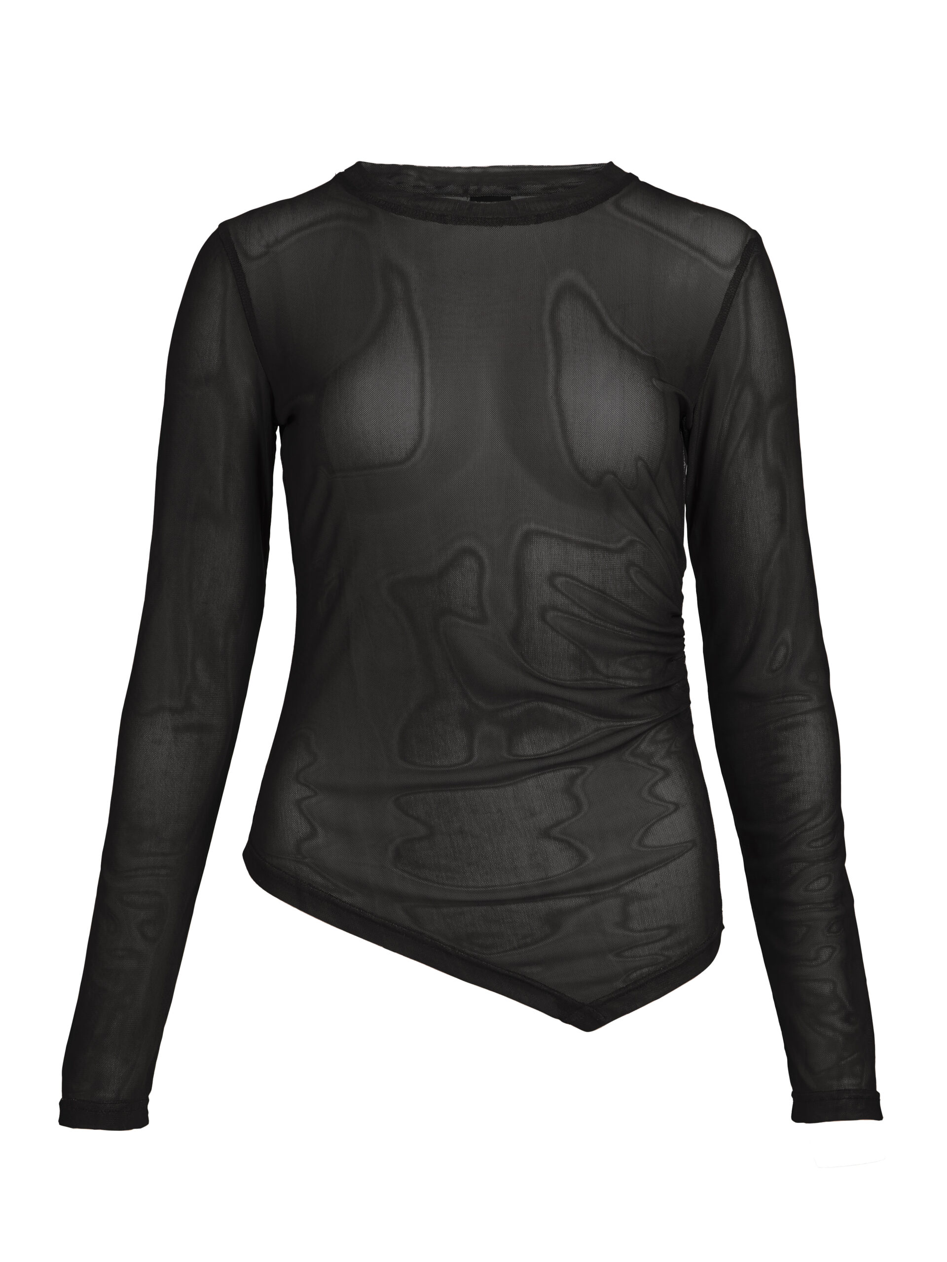 Denne meshbluse har et let transparent udtryk og en asymmetrisk afslutning forneden, som skaber en spændende og moderne silhuet. Materialet smyger sig let om kroppen, mens de lange ærmer og runde halsudskæring giver et enkelt og elegant udtryk. De diskrete syningsdetaljer fremhæver blusens form og gør den velegnet til både lag-på-lag eller som blikfang i sig selv.