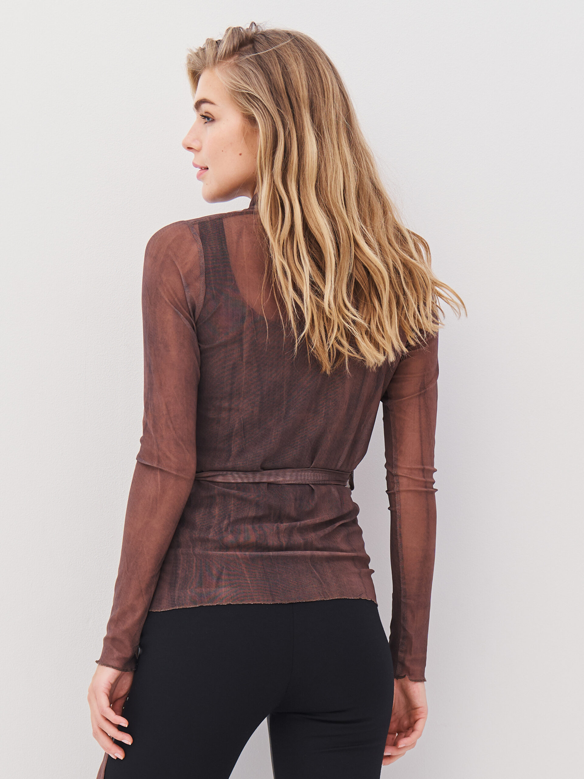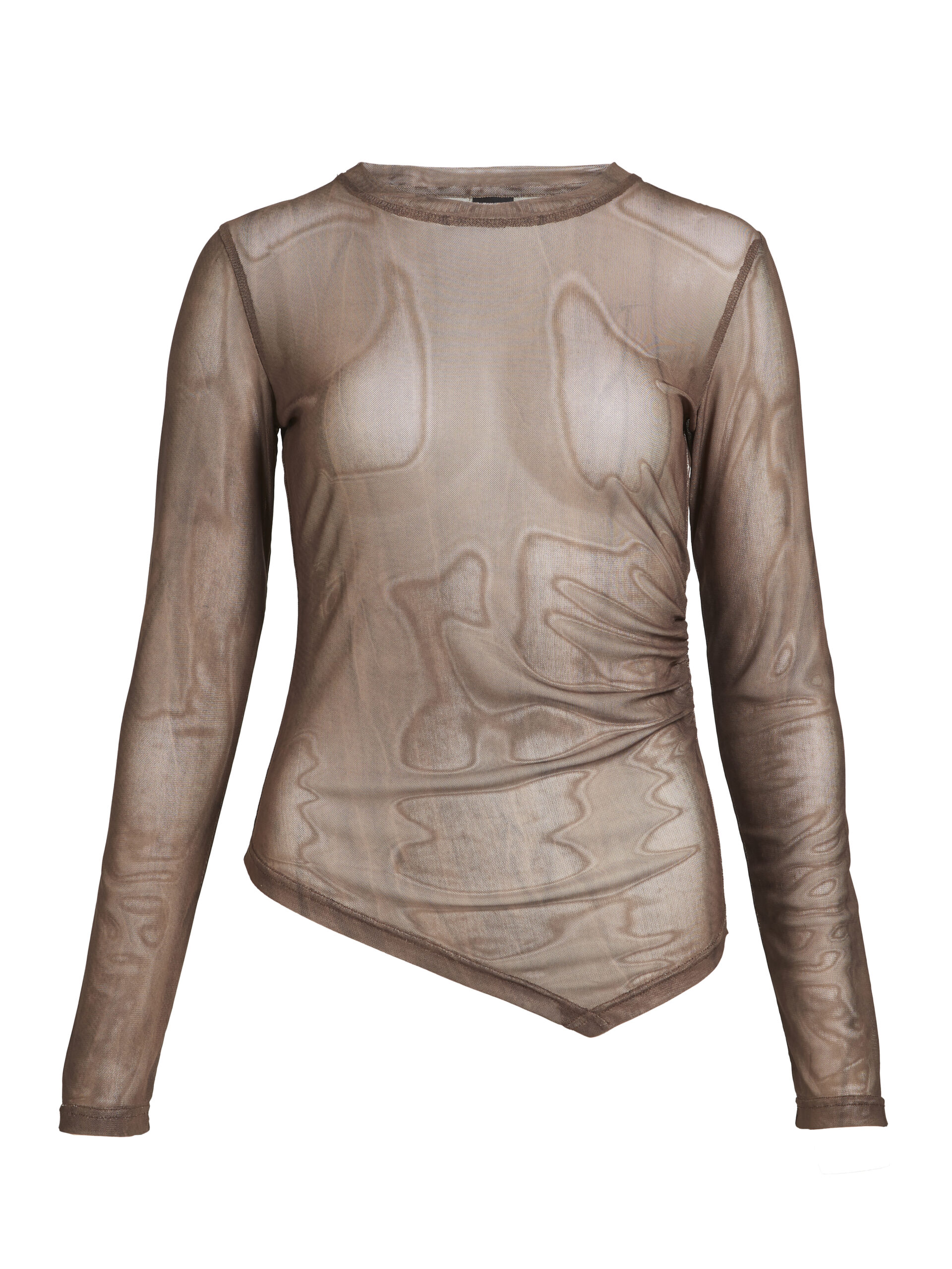 Denne meshbluse har et let transparent udtryk og en asymmetrisk afslutning forneden, som skaber en spændende og moderne silhuet. Materialet smyger sig let om kroppen, mens de lange ærmer og runde halsudskæring giver et enkelt og elegant udtryk. De diskrete syningsdetaljer fremhæver blusens form og gør den velegnet til både lag-på-lag eller som blikfang i sig selv.