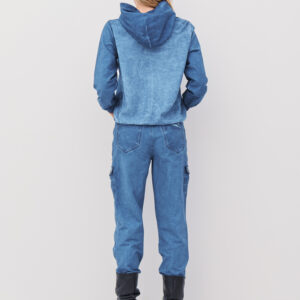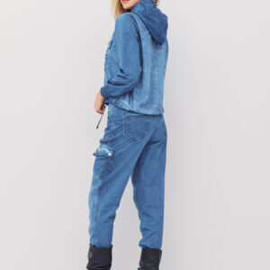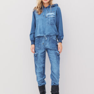 Afslappet hættebluse med snore træk og en brystlomme med nitter der tilføjer modellen et dejligt råt udtryk. Blusen har gode ribkantsærmer og kan trækkes sammen med en snor forneden.