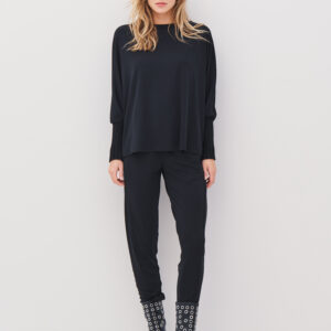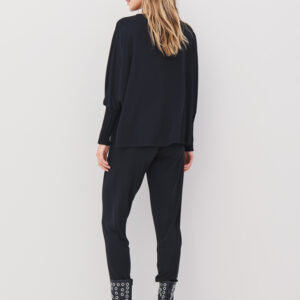 Blusen har en løs og behagelig pasform med brede flagermusærmer, der samles i lange, ribstrikkede manchetter. Den runde halsudskæring og det enkle design gør blusen nem at style, mens de markante ærmeafslutninger tilfører karakter og kant. Stoffet falder let og giver en afslappet, men stadig stilfuld silhuet.