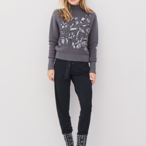Strikbluse med bølget mønster og høj ribkrave som med de dekorative pailletter giver et sofistikeret, varmt og stilrent udtryk. Ribkanterne ved ærmer og bund fuldender det velafbalancerede design på denne komfortable sweater.