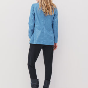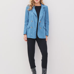 Glamourøs blazerjakke i en smuk blå nuance med et blankt overflademønster der har et iøjnefaldende udtryk. Den har dobbeltradet knaplukning med klassisk reverskrave og 2 frontlommer med klap og er figursyet.