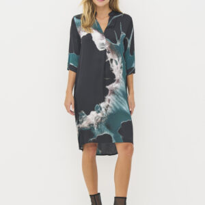 Tunikaén/Kjolen har en løs, lige pasform med 3/4 lange ærmer og en elegant V-udskæring med kinakrave. Den har en blød silhuet og en let struktur med  dekorative læg både foran og på ryggen, som giver ekstra bevægelighed. Der er lommer i siden .
