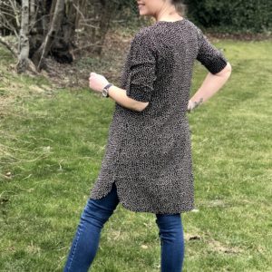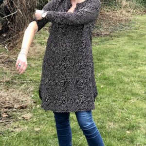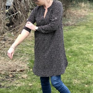 Tunikaen har v-hals, som ender ud i et lille læg og er sort med sandfarvet prikker Ærmerne er 3/4 med fold, som lukkes med en knap, så du selv kan bestemme om de skal være lange eller korte. Den går til knæene, og har en lille slids i begge sider og kan styles med stramme bukser eller til sommer når det bliver varmt, med bare ben og sandaler. En tunika som denne, er altid en god model at have i garderoben. Modellen er til den store side.