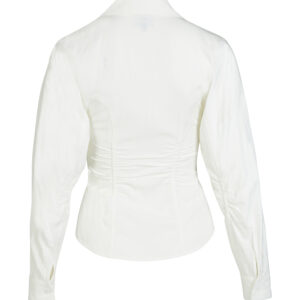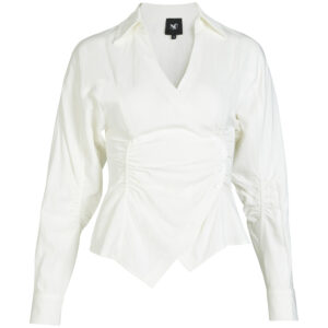 Fremhæv taljen med denne elegante skjorte med slå-om-effekt og figursyet pasform. De fine rynkedetaljer i siden og ærmerne giver bevægelse og struktur, mens det spidse frontstykke skaber en sofistikeret silhuet. Kraven og knaplukningen understreger det klassiske udtryk med et moderne twist.
