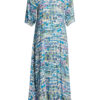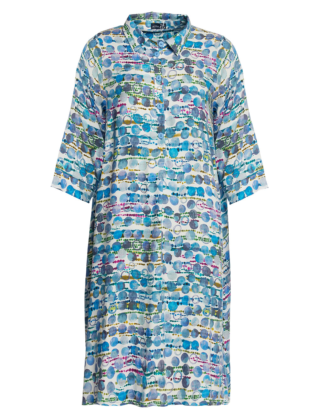 Kjole i A-facon med ekstra vidde og rummelighed. Den sidder normalt til over skulderen og øverst på ryggen, men fra ærmegabet og nedover, tilføres der ekstra vidde ved hjælp af A-faconen og et læg på ryggen mellem skulderbladene. Modellen har lommer i siden og i halskanten en krave og knaplukning. Super flot print <3