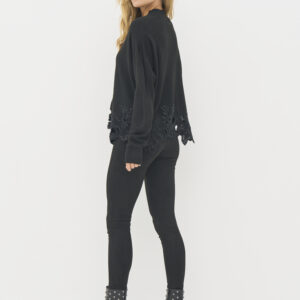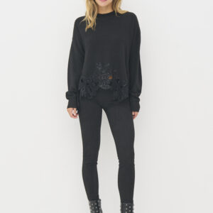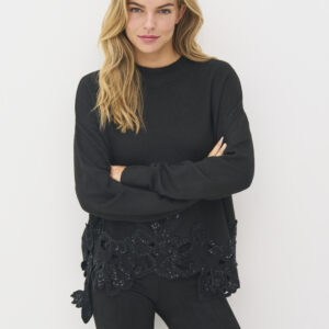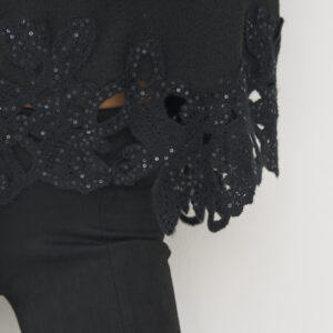 Giv dit outfit et eksklusivt touch med denne rummelige strikkede poncho med dekorativ blondekant. Den har en afslappet pasform og en rund halsudskæring, mens den markante blonde forneden giver et feminint og festligt udtryk. Det let transparente blondefelt prydes af små pailletter, der fanger lyset og skaber diskret glans.