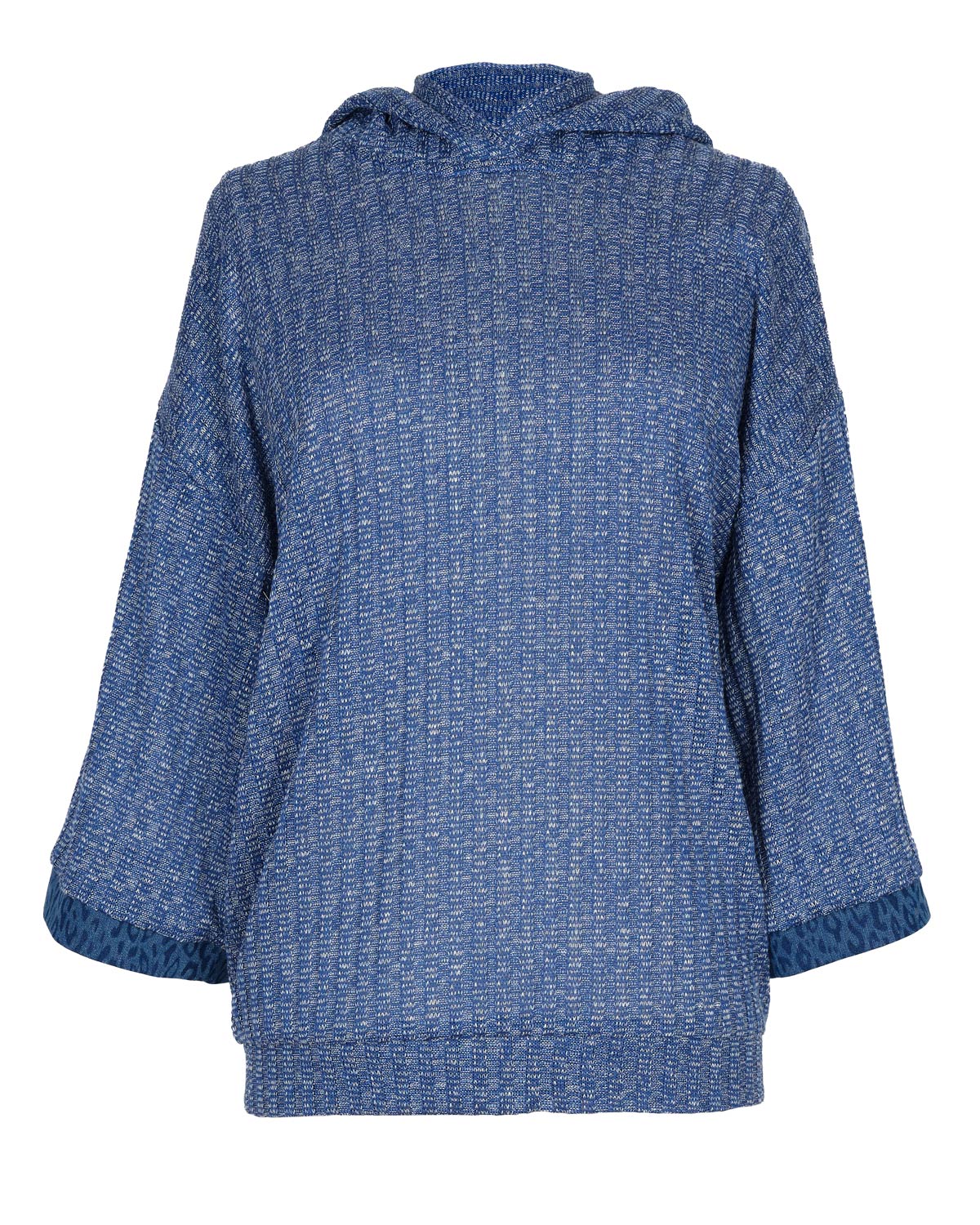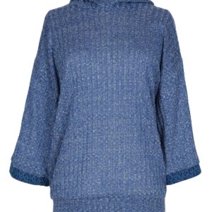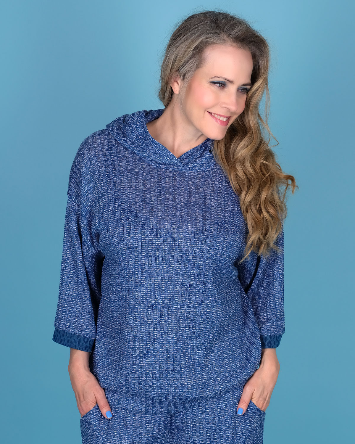 Lækker komfortabel hoodie i en dejlig blød og blåmeleret strik. Modellen har 3/4 lange ærmer som er afsluttet med en cowboykant i leopardprint. Typisk Margot DNA 🙂