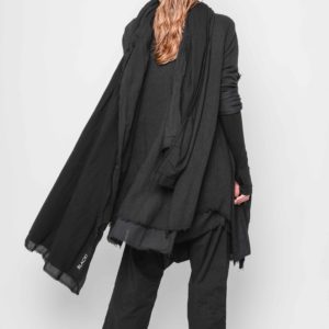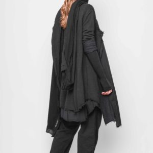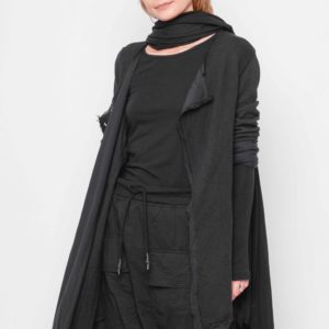 Skøn cardigan i lækker jersey. Modellen er skåret med vid A-facon fra ærmet med flere dekorative lodrette syninger. Cardigan har et ekstra lag vævet bomuld som “foer” og lukkes asymmetrisk med knap. Alle afsluttende kanter er rå.