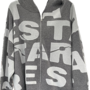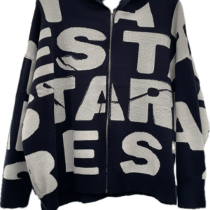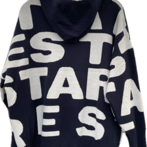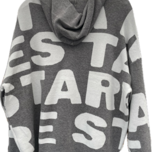 Rummelig strik cardigan med bogstaver og similisten foran. Modellen har gennemgående lynlås og hætte og er til den store side.