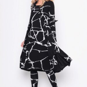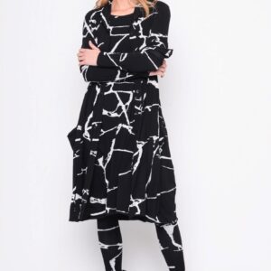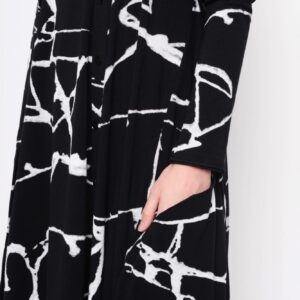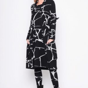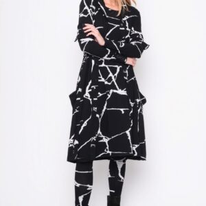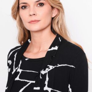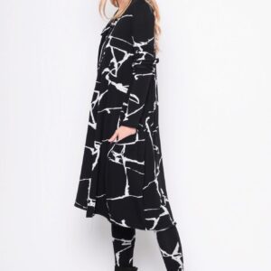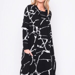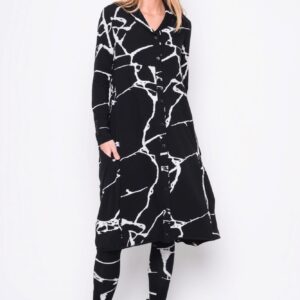 Cardigan i lækker blød bomuldskvalitet i klassisk sort/hvidt print som her ses i kombination med kjolen i samme serie. Modellen har A-facon og dermed er der meget plads til mave og numse. Cardiganen er gennemknappet med kokosknapper og har en fin lille revers. Alle kanter er skåret og har en rå afslutning og der er lommer i siden. For at fuldende boheme looket er den længere bagpå 🙂