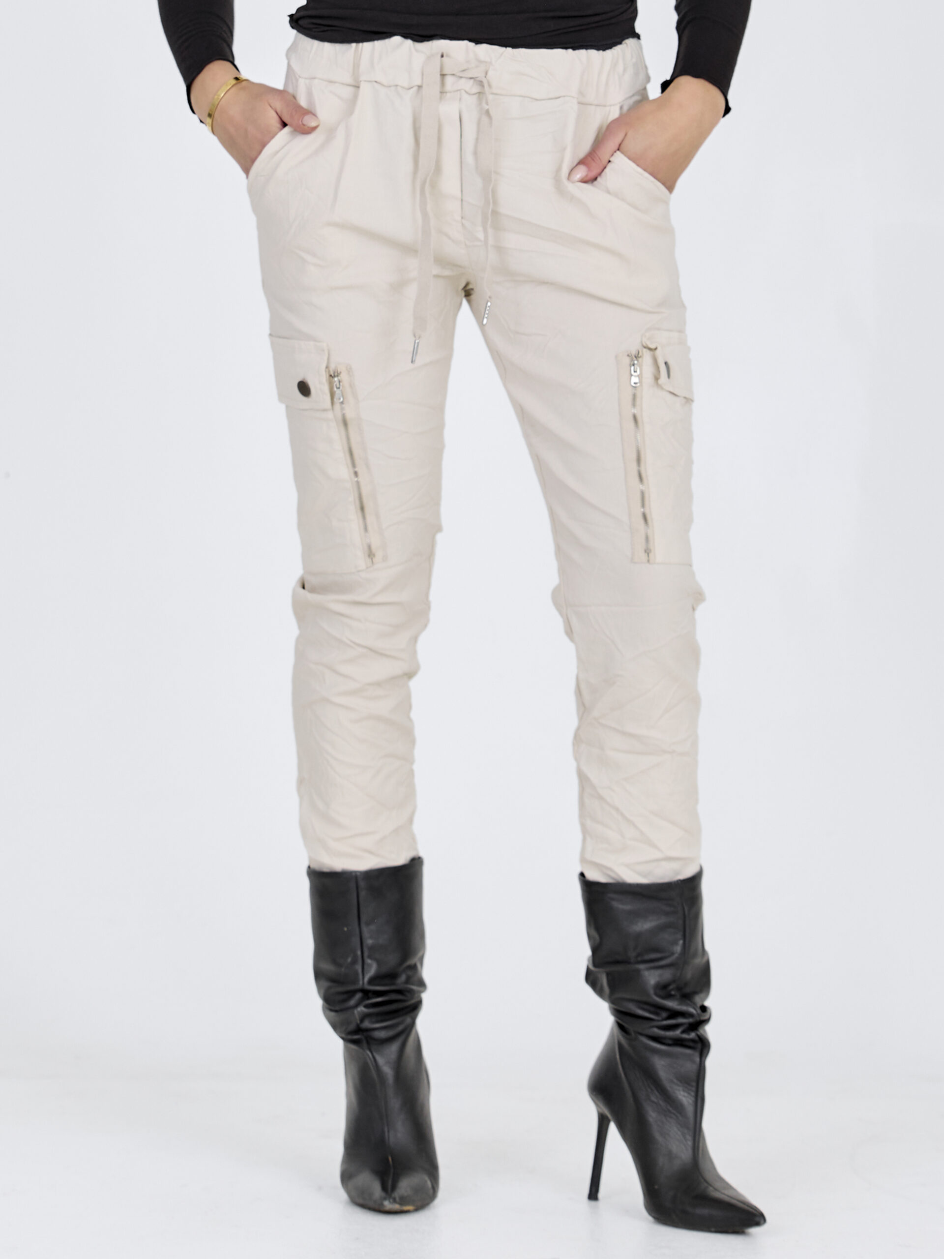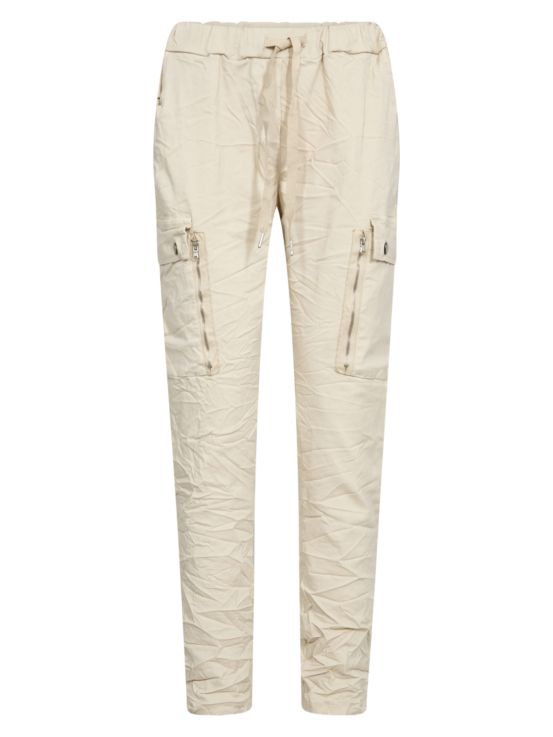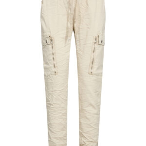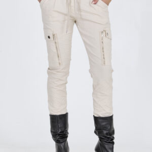 Designet har en let baggy silhuet og en elastisk talje med bindebånd, der giver en behagelig og justerbar pasform. Bukserne er udstyret med to markante lommer foran med knaplukning samt en dekorativ, lang lynlås, som tilfører et råt og moderne udtryk.