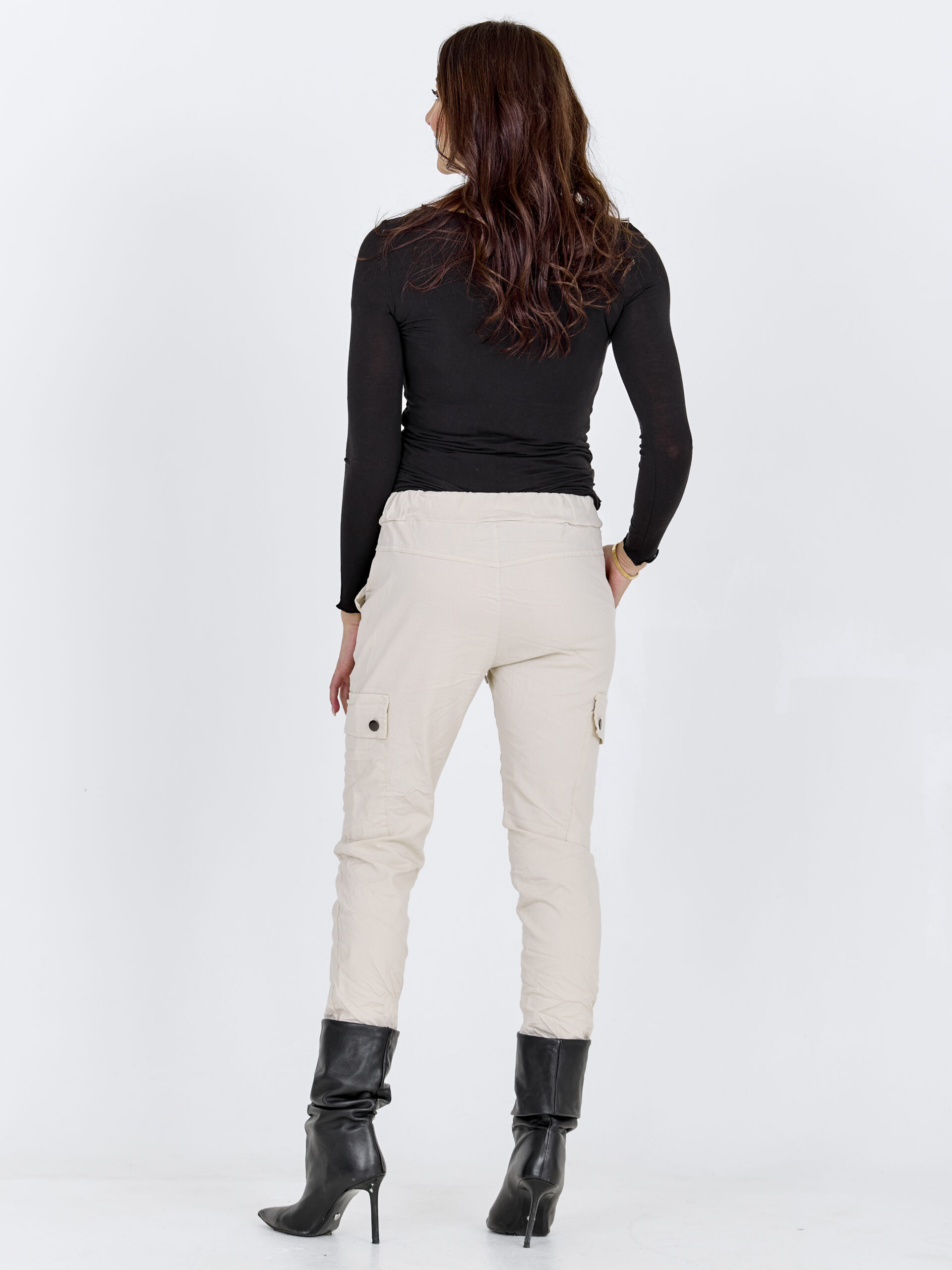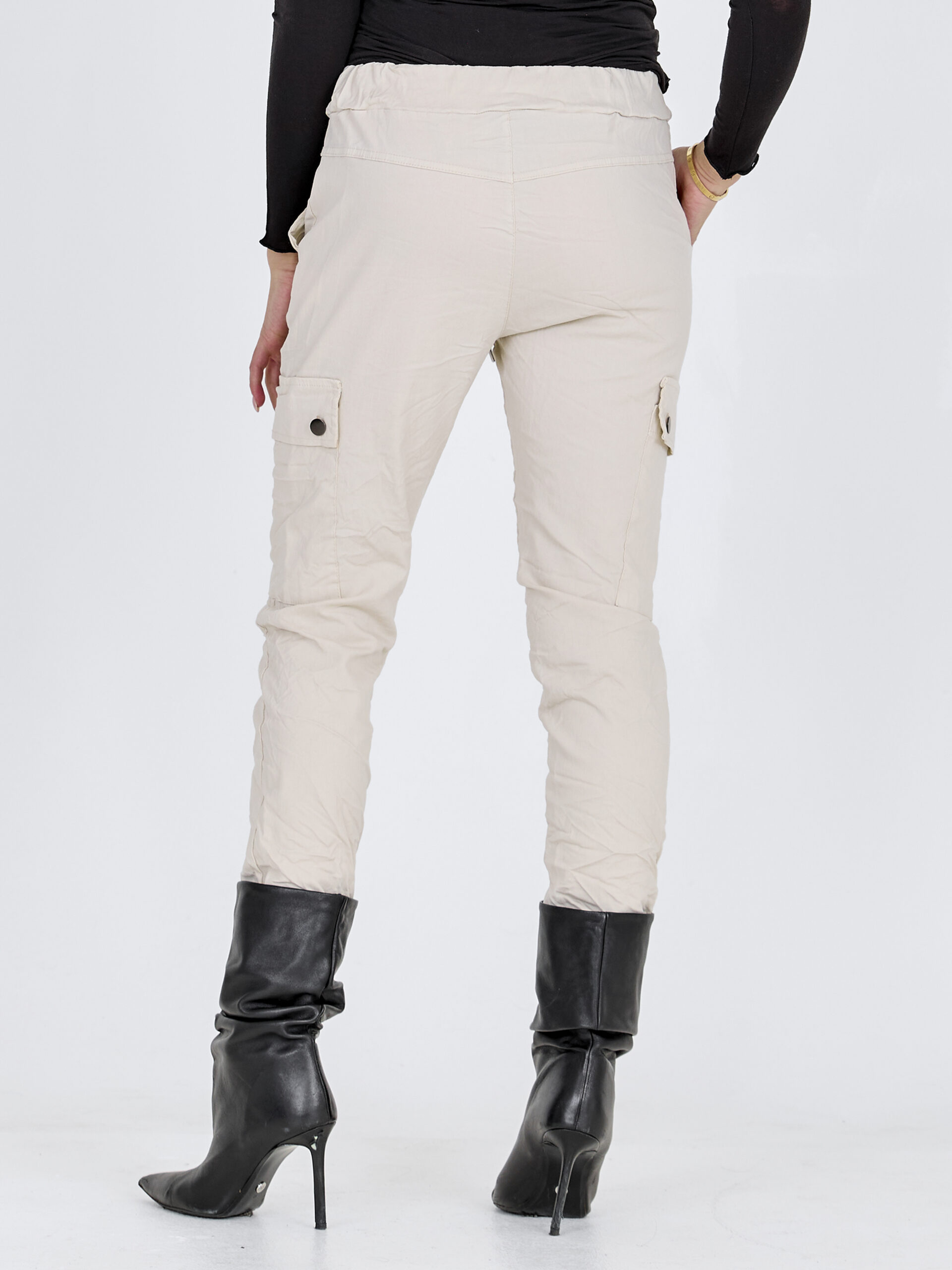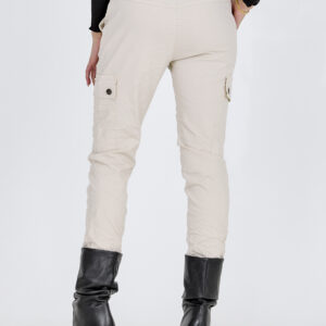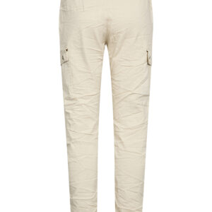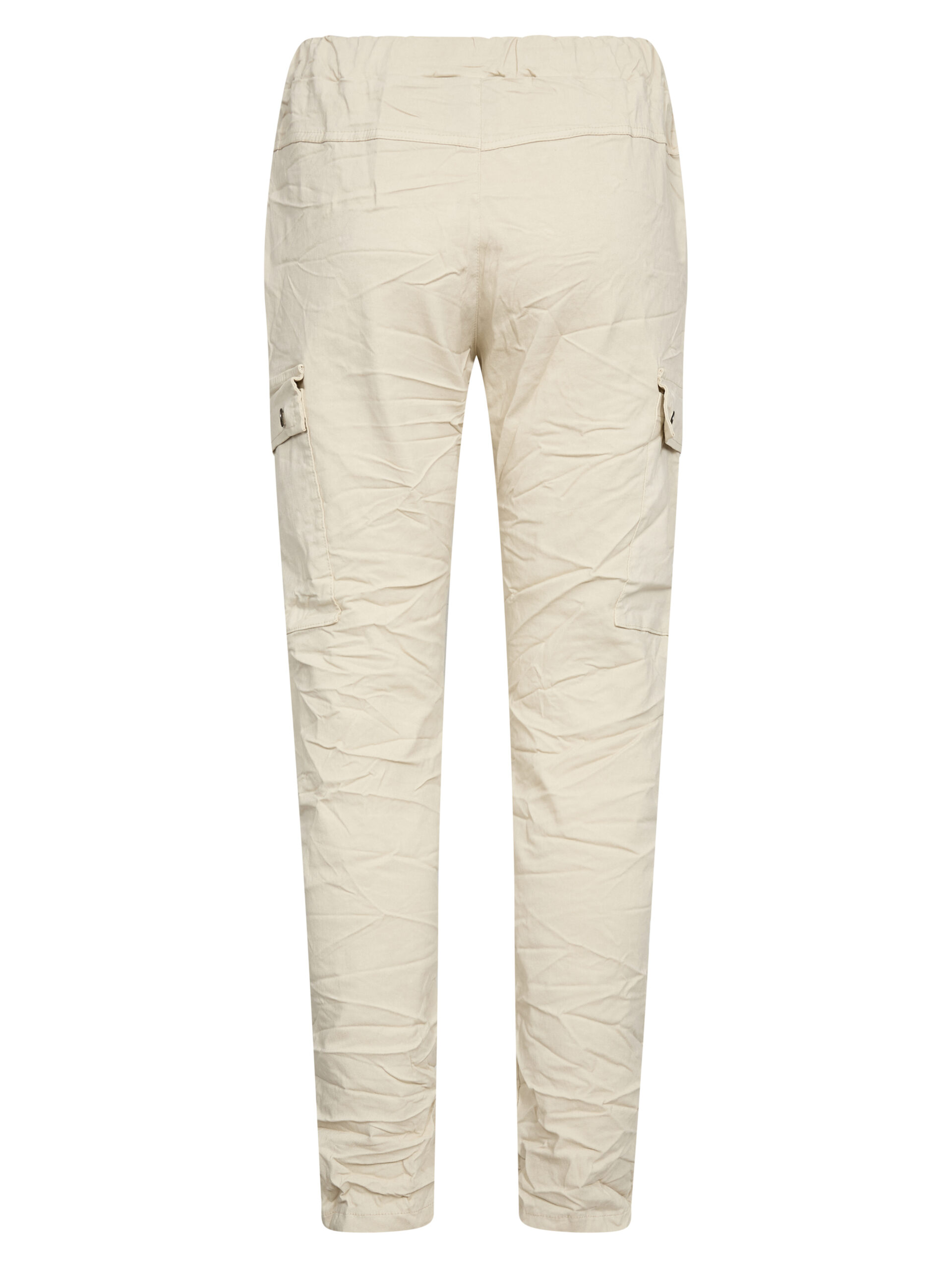 Designet har en let baggy silhuet og en elastisk talje med bindebånd, der giver en behagelig og justerbar pasform. Bukserne er udstyret med to markante lommer foran med knaplukning samt en dekorativ, lang lynlås, som tilfører et råt og moderne udtryk.