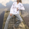 Kort bluse eller jakke med korte ærmer der kan rulles op med trykknap. Modellen er gennemknappet og har snoretræk i taljen så du selv kan bestemme hvor tæt den skal sidde.