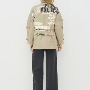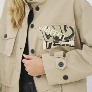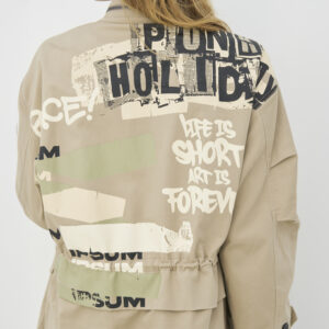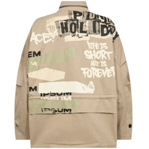 Jakke i løs pasform med et afslappet og funktionelt udtryk, høj krave og gennemgående knaplukning fortil. På forsiden er den designet med flere store lommer og justerbar snøre i taljen, som giver mulighed for at tilpasse pasformen. Bagsiden er dekoreret med grafiske prints, der tilfører et markant og moderne twist. Style jakken med en enkel top og løse bukser for et afslappet hverdagslook, eller brug den med en varm strik indenunder på køligere dage.