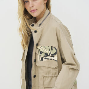 Jakke i løs pasform med et afslappet og funktionelt udtryk, høj krave og gennemgående knaplukning fortil. På forsiden er den designet med flere store lommer og justerbar snøre i taljen, som giver mulighed for at tilpasse pasformen. Bagsiden er dekoreret med grafiske prints, der tilfører et markant og moderne twist. Style jakken med en enkel top og løse bukser for et afslappet hverdagslook, eller brug den med en varm strik indenunder på køligere dage.