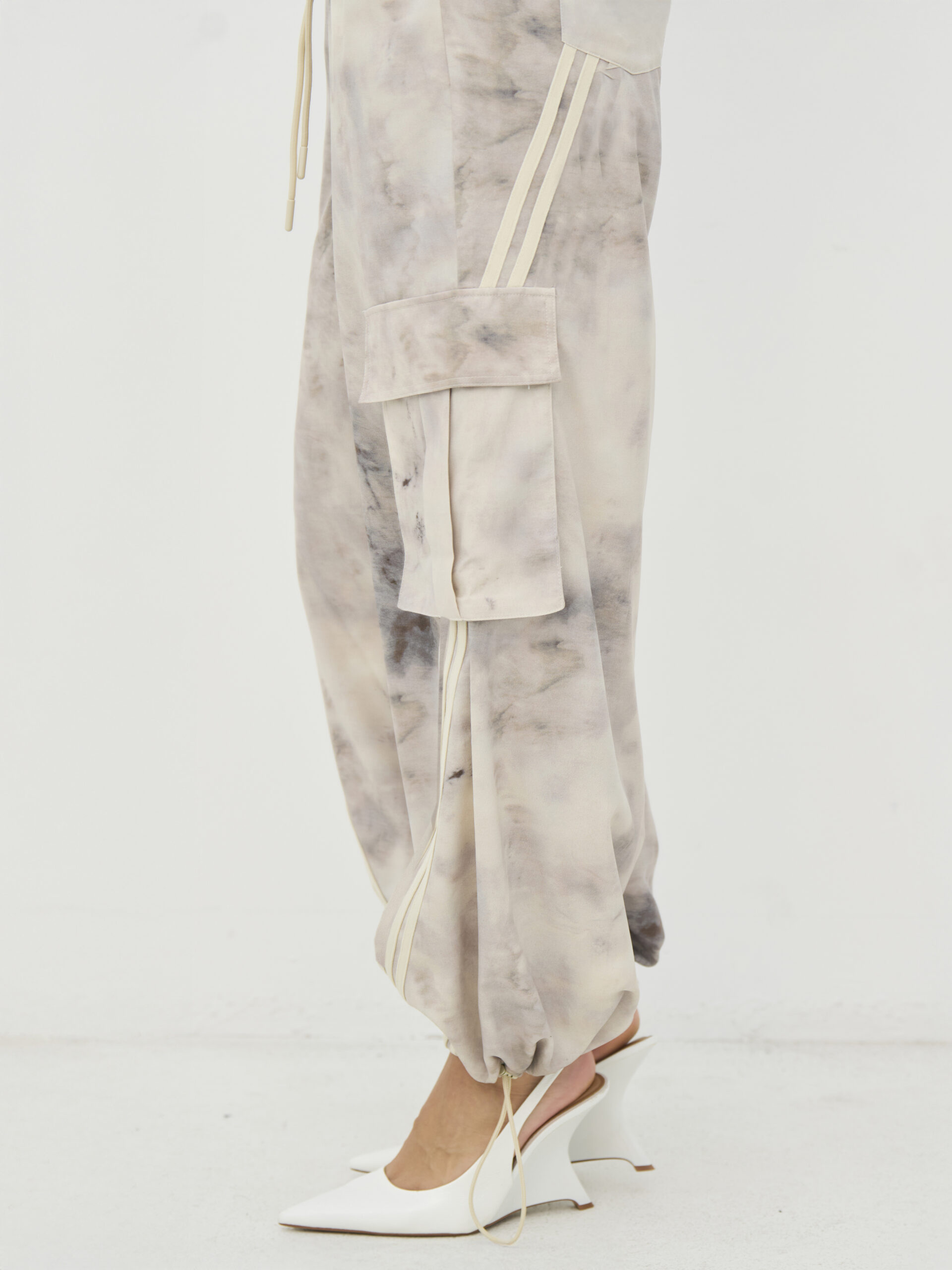 Skønne og cool bukser med afslappet pasform med volumen i benene og elastik samt snøre i taljen, som gør dem nemme at justere. De store cargolommer på siderne tilfører et cool udtryk, mens snøredetaljen ved anklerne giver mulighed for at tilpasse faconen. Fronten er enkel, og bagsiden følger samme rolige linje. Style bukserne med en enkel top eller skjorte og eventuelt den matchende overdel for et afslappet, men gennemført hverdagslook.