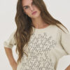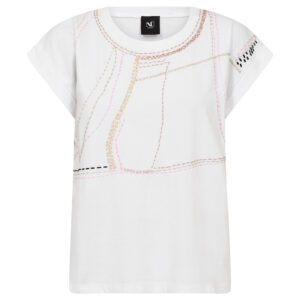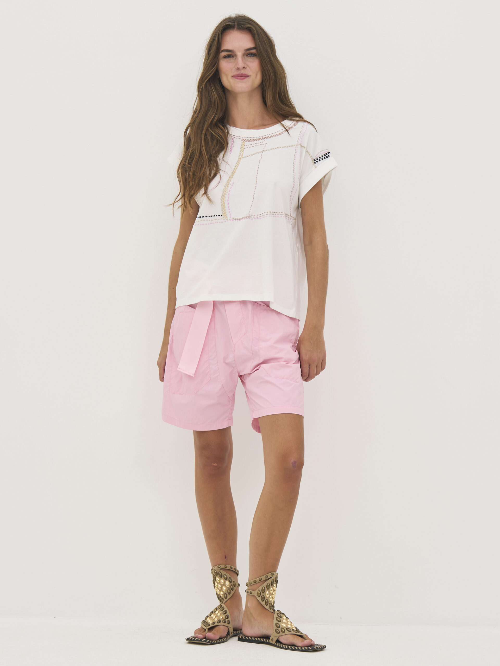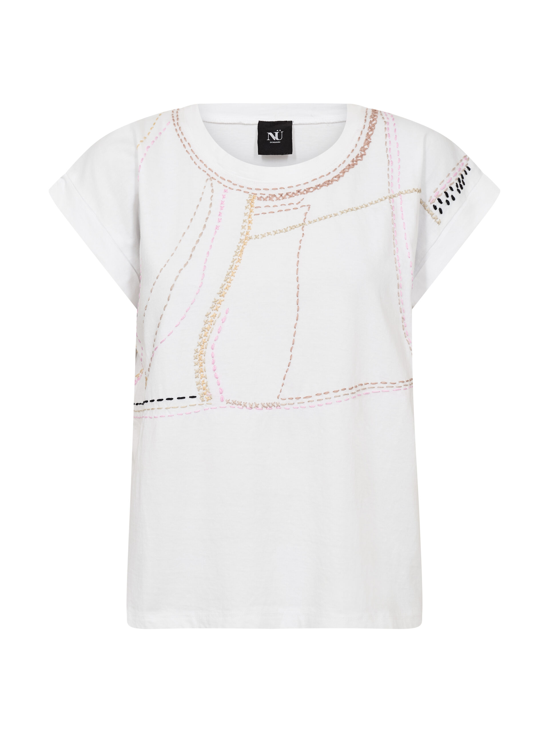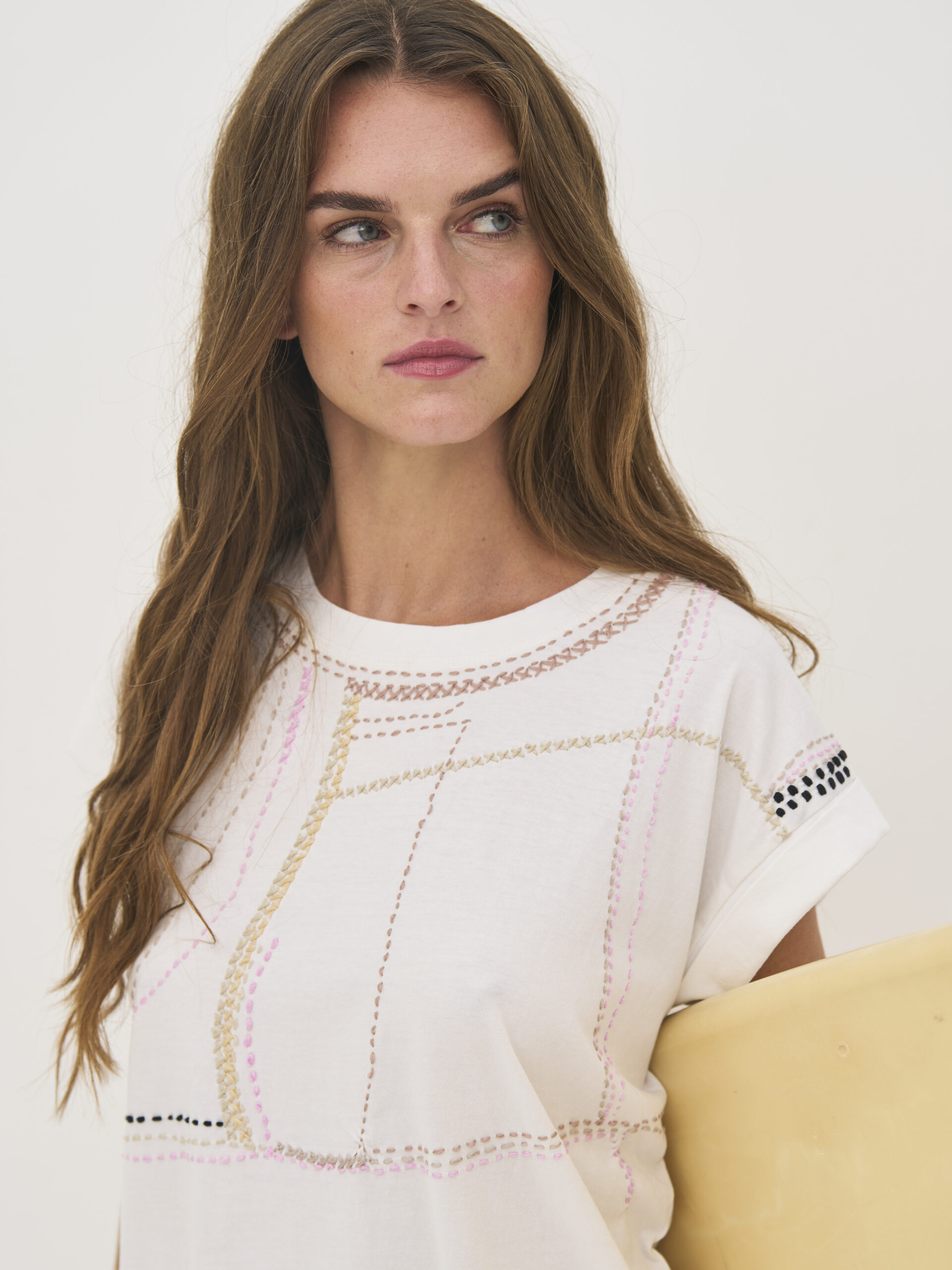 Lækker blød t-shirt i ren bomuld, som gør den ekstra behagelig og åndbar til hverdagsbrug. Modellen har rund halsudskæring og en lige pasform, der falder roligt langs kroppen. De opsmøgede korte ærmer giver et afslappet præg, mens det dekorative broderi foran tilfører et unikt og grafisk element. Bagtil er designet holdt enkelt.
