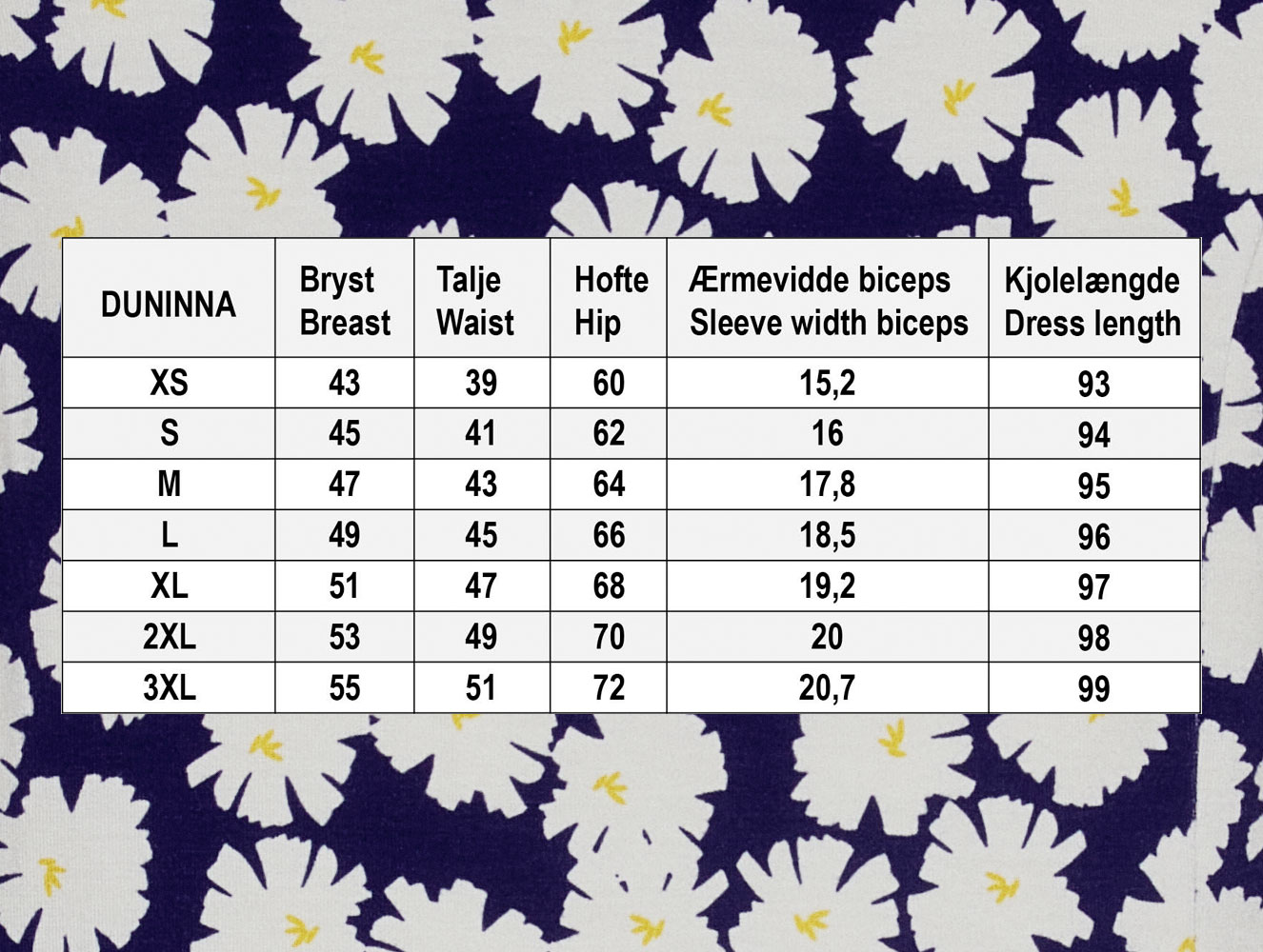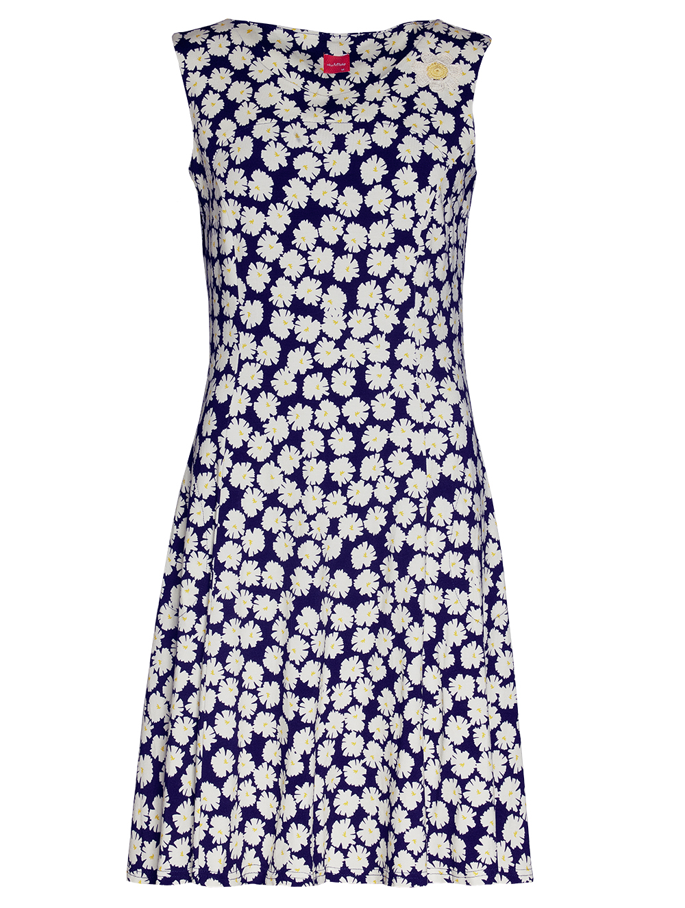 Skøn kjole i den populære duNinna model, som sidder til over barmen og falder blødt om mave og hofter. Modellen er i et flot blomsterprint med margueritter. Kjolen er uden ærmer og er pyntet med 1 håndhæklet blomst ved halsudskæringen i venstre side og har lommer i sidesøm.