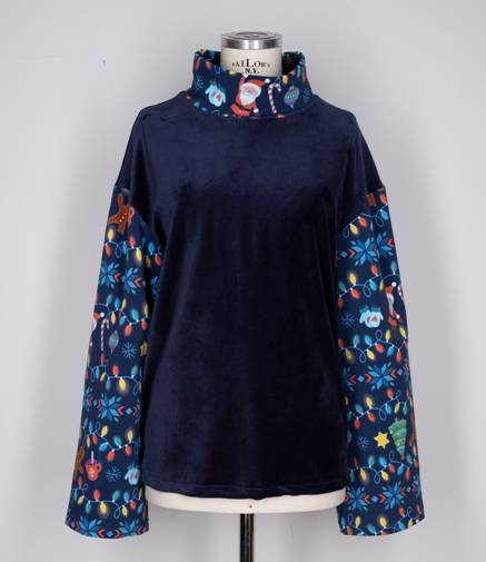 Den fineste sorte velour bluse med print fra tidligere julekjole på ærmer og hals. ( mod stofspil)