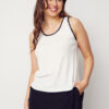 Anderledes flot blød top i viscose med dekorative hvide strikkanter.