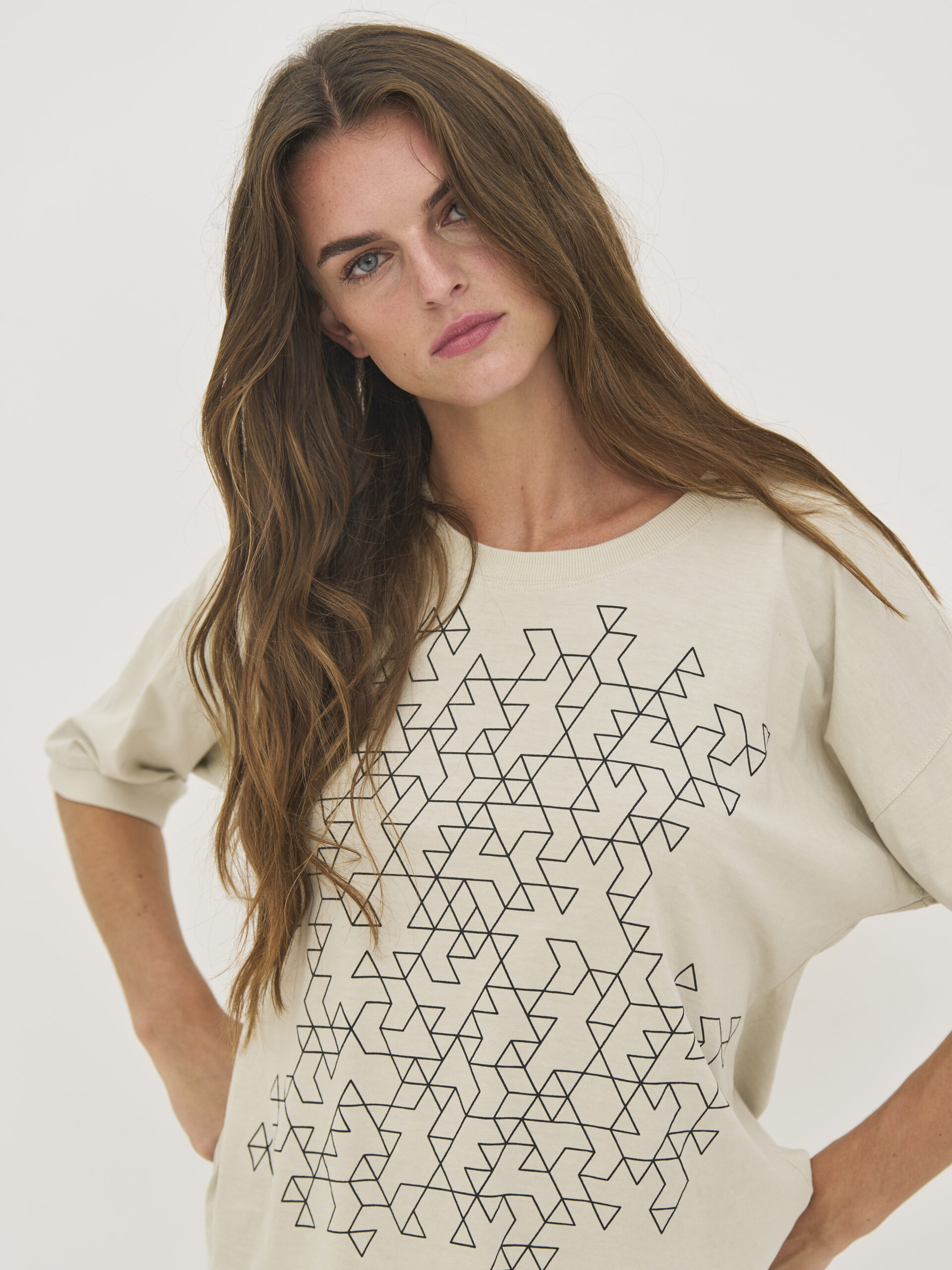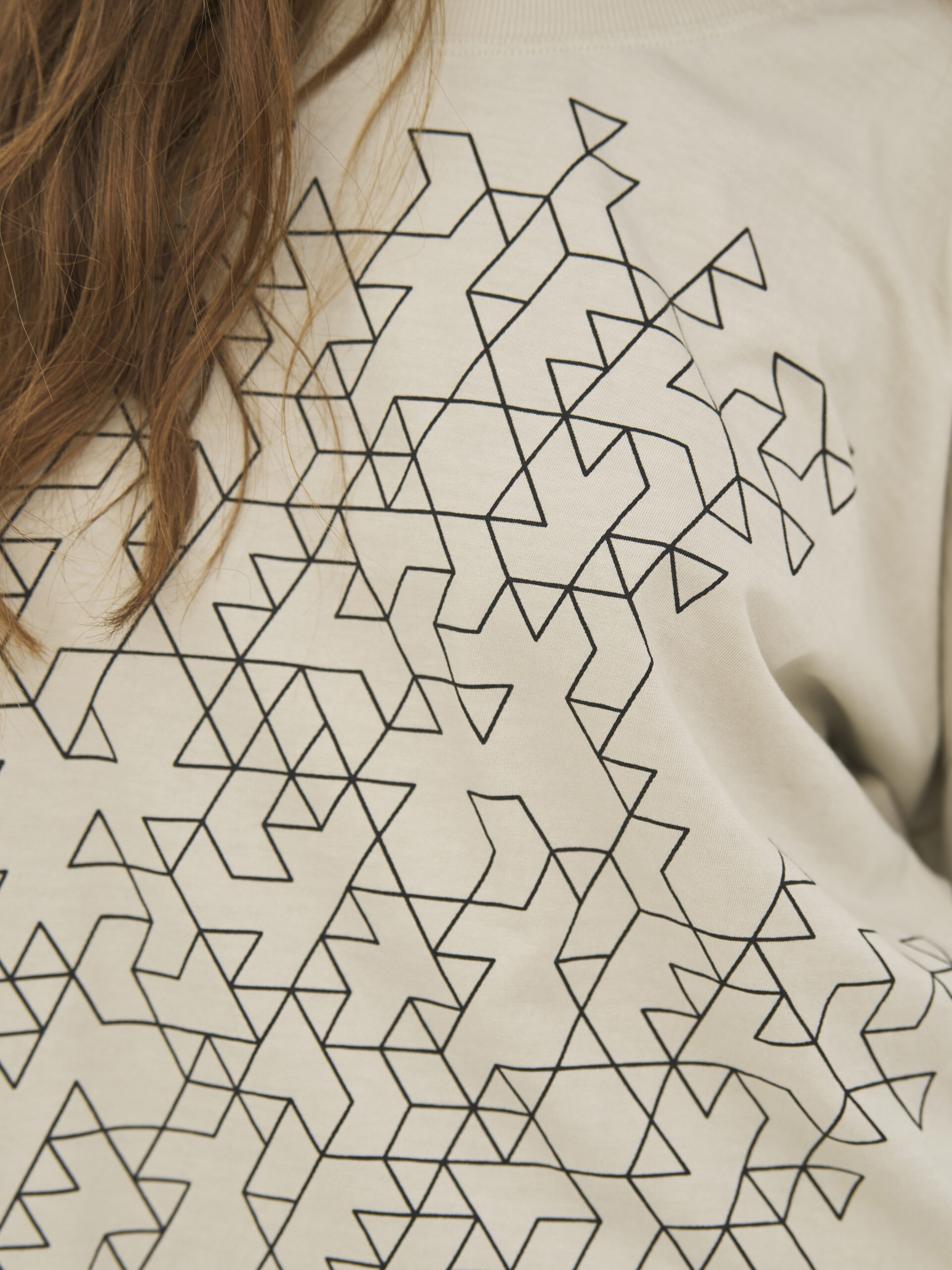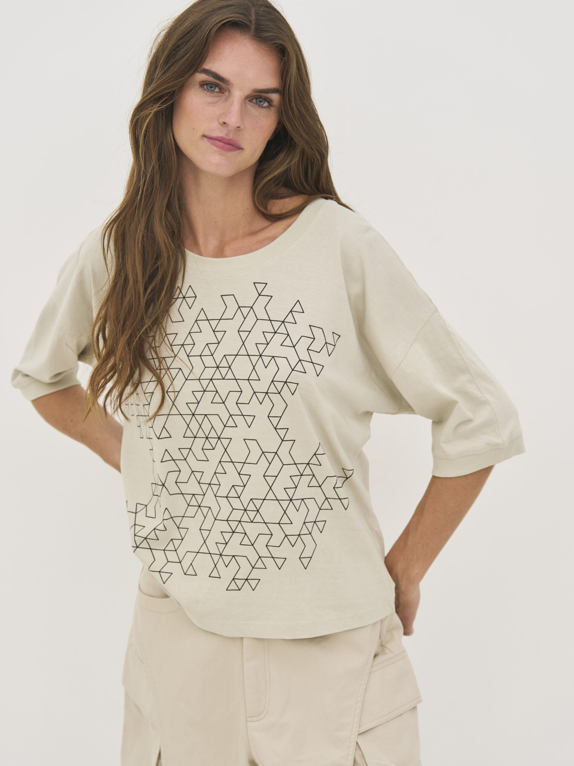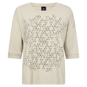 Lækker blød t-shirt i ren bomuld, som gør den ekstra behagelig og åndbar til hverdagsbrug. Den har en løs pasform med dropped shoulders, der skaber et ubesværet og moderne udtryk. Modellen har et grafisk print foran og rund hals med ribkant. Ribkanter er der ligeledes på ærmekanten.