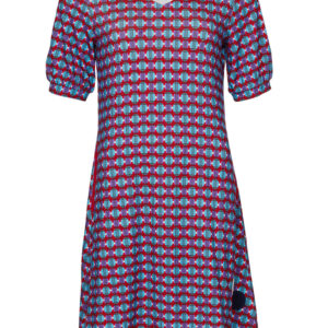 Skøn kjole i den populære duCaroline model, som sidder til over barmen og falder blødt om mave og hofter. Kjolen har korte ærmer som er afsluttet med lille manchetkant og let puf og i det skønneste grafiske print. Modellen er pyntet med håndhæklede broderier forneden i venstre side og har lommer med rød pippingkant i siden og forneden på kjolen. Mega flot kjole –