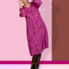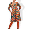 Kjolen er glat hen over ryggen har en rund hals og 3/4 lange ærmer med en lille manchet og der er stiklommer i sidesøm.