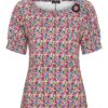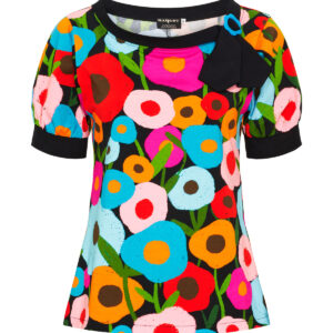 Blomsterhave i dejlig farver. Blusen har bred halsudskæring i sort som krave med blomsterspænde som pynt. Ærmer er rynket let til bred kant i sort.