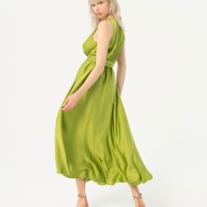 Festkjole, flot og fejende, i lækker limegrøn farve. Kjolen har slå-om i overdel med elastik i ryggen for perfekt pasform og lynlås i siden. Skørtet er rundskåret og bæltet understreger det skønne look.