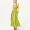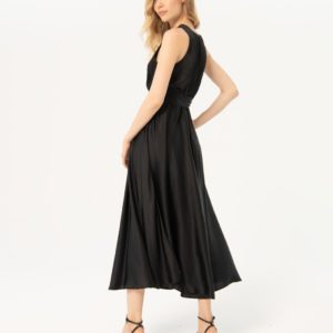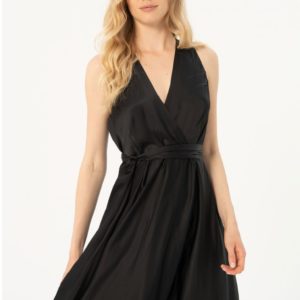 Festkjole, flot og fejende. Kjolen har slå-om i overdel med elastik i ryggen for perfekt pasform og lynlås i siden. Skørtet er rundskåret og bæltet understreger det skønne look.