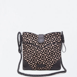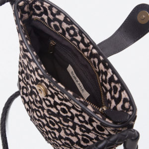 Smart taske i jacquard vævet stof med læder detaljer. Tasken har flettet læderrem, lynlåslukning og læderstrop med magnetknap og indvendig lomme