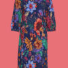 Super flot kjole i A – facon i model duGitha, hvor kjolen sidder til over barm og falder blødt med mere rummelighed om hofter og mave, da der er 2 læg foran og bagpå. Modellen er i et blomsterprint og halsudskæringen er rund og pyntet med 1 håndhæklet sommerfugl.