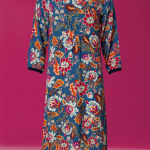 Det skønneste lette og feminine print på denne fine duMilde etc.kjole. Modellen bliver samlet under barm med små læg. Lukkes i ryggen med lille knap og ærmerne afsluttes med manchetkant. Kjolen har let v-hals,  lommer i sidesøm og “dypper” elegant i siderne. Printet er et væld af blomster i alle mulige farver på petrolfarvet bund som gør at det er super nemt at tilsætte farver.