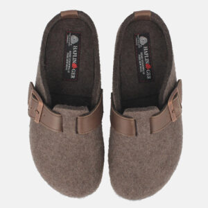 Behagelig og komfortabel hjemmesko fra Haflinger lavet i jomfru uld som er gråmeleret og har et læder spændetap henover vristen til at indstille bredden med.