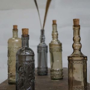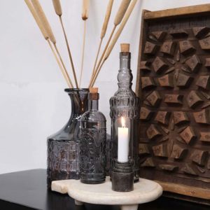 Flot grå glasflaske med en smuk silhouet, dekorativt motiv og korkprop. De fortryllende flasker er velegnet til flere forskellige dekorative formål. Nogen vil bruge den som en blomstervase til en enkelt stilk eller gren, mens andre vil bruge den til olie, drikkevarer eller stearinlys. Derudover kan glasflasken også bruges som en smuk dekoration i sig selv, alene eller sammen med de andre flasker i serien. Flasken er lavet af 100% genbrugsglas, og der kan derfor forekomme små bobler og mindre ujævnheder i glasset.