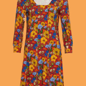 Skøn kjole i den populære Ninna model, som sidder til over barmen og falder blødt om mave og hofter. Kjolen har 3/4 lange ærmer som er afsluttet med bred manchetkant og let puf og lommer i sidesøm. Hele herligheden er afsluttet med 1 flot håndhæklet blomst nederst i højre hjørne. Mega flot kjole –