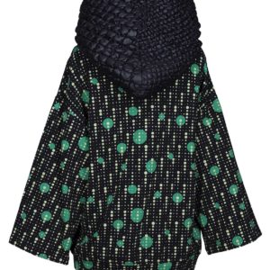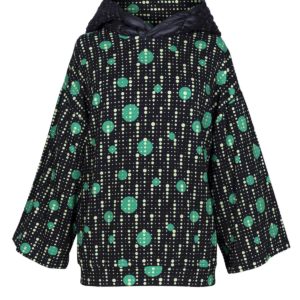 Så hyggelig en bluse med prikker på marineblå bund. Rummelig model, ærme med vidde og foeret hætte, som kan foldes så den er med vatteret stof eller prikket stof.