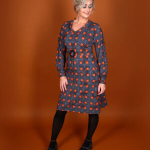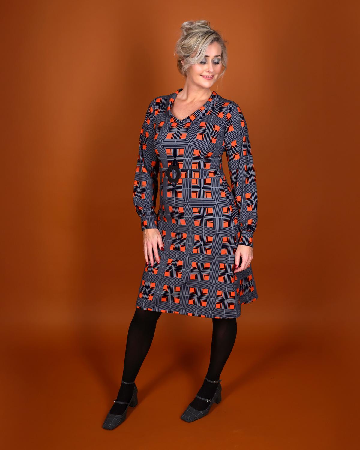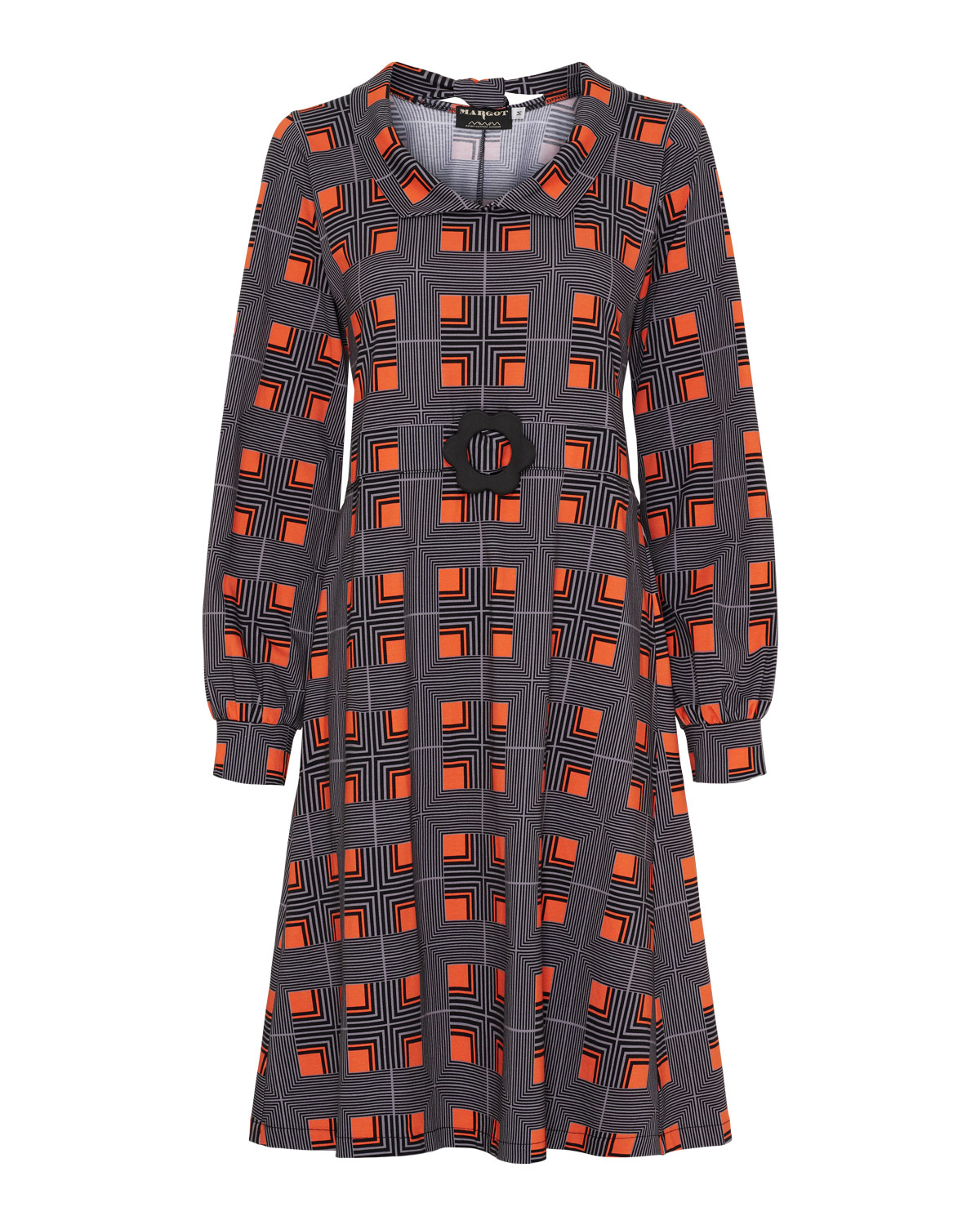 Flot kjole i et grafisk print med orange, grå og sort, i modellen Supreme style. Modellen er skåret under brystet og pyntet med en skøn sort blomsterknap. Ærmerne er lange og afsluttes med bred manchetkant og let puf. Kraven er ombukket foran og lukkes med bindebånd bagpå.