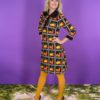 Skøn kjole i spændende grønt og sort retro print i en lang udgave. Kjolen har høj hals og 3/4 længde ærmer og er super fin til dig der kan lide tætsiddende kjoler. Vil du understrege din talje – kan du med fordel bruge Margots powerbelt <3