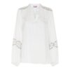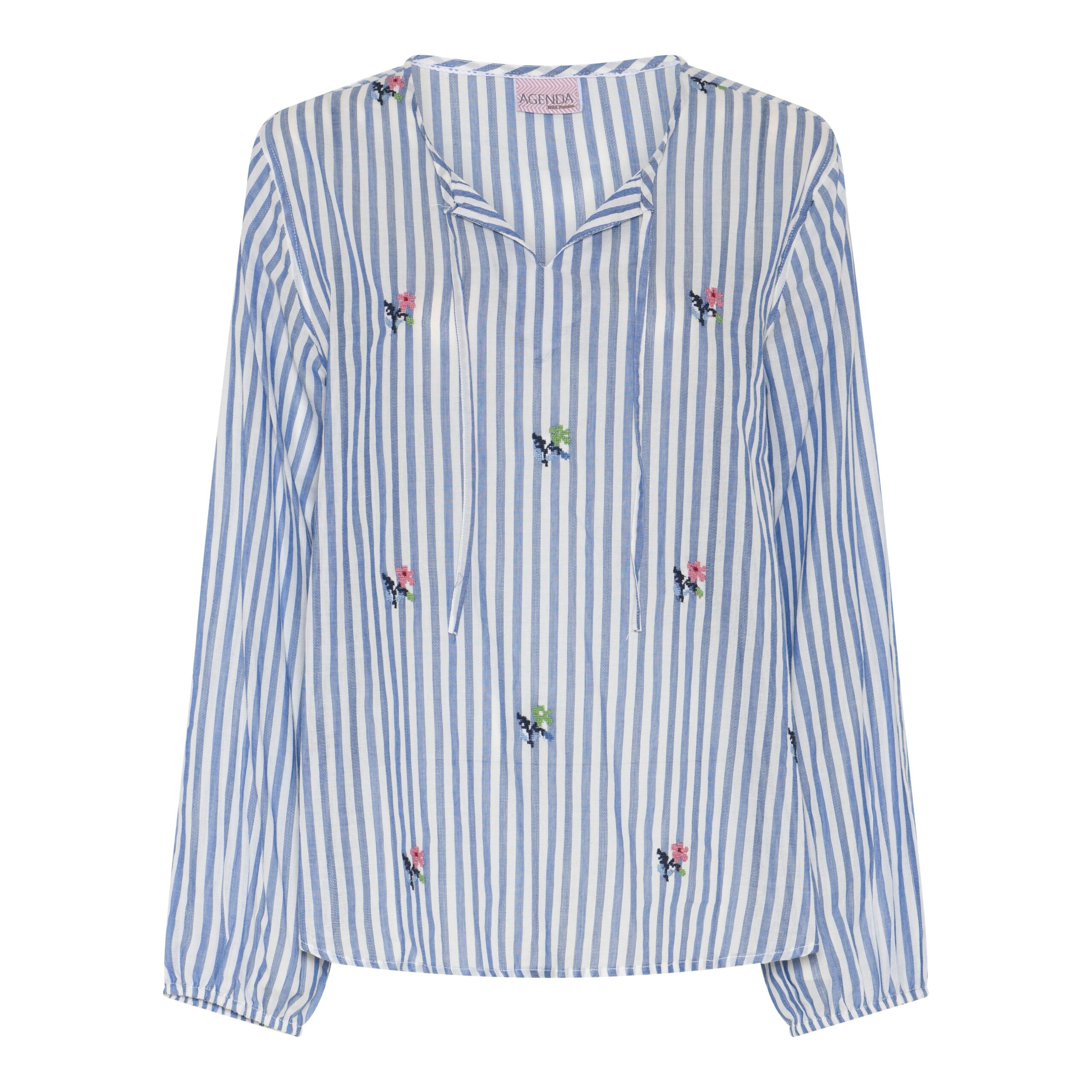 Super flot og feminin let stribet bomuldsskjorte med de fineste broderier foran og med lille v-hals og snorer.
