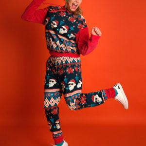 HoHo julepants i skønt print. Buksen har bred elastik linning i velour med bindebånd, “pynte-gylp” med knapper, stukket pressefold foran samt skrålommer. Forneden er buks afsluttet med bred kant i velour. Hyggelig match med blusen Perky Angelears og som prikken over i’et pyntet med øreringe med Julekugler og Juletræ