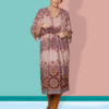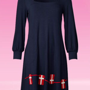 Skøn kjole i den populære duCaroline model, som sidder til over barmen og falder blødt om mave og hofter. Kjolen har 7/8 lange ærmer som er afsluttet med lille manchet kant. Modellen er pyntet med 1 håndhæklet broderet dannebrog ranke og der er lommer i siden. Mega flot kjole –