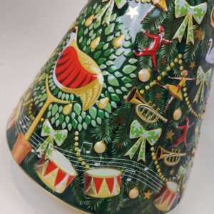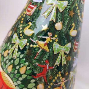 Kagedåse som et smukt pyntet juletræ der roterer rundt på sin fod og spiller jule melodien Deck the Hall.