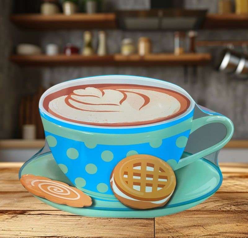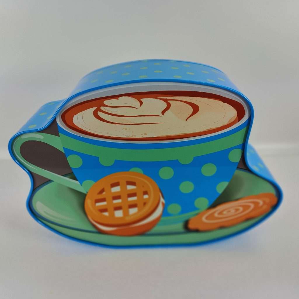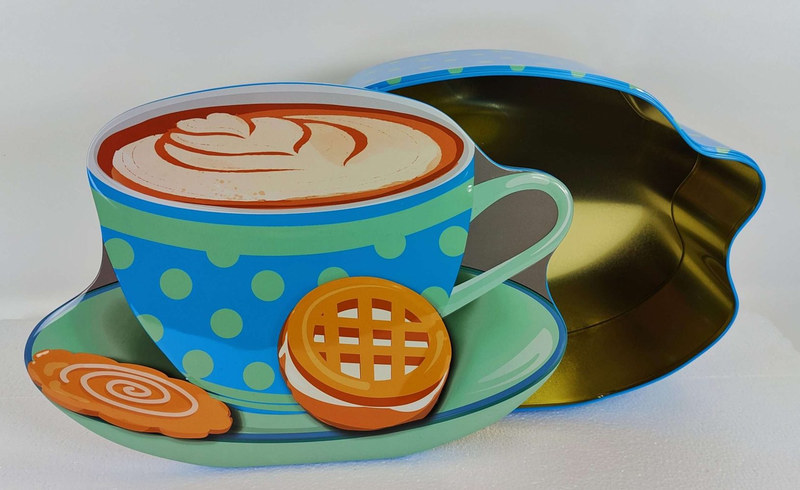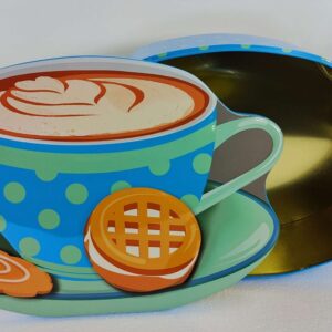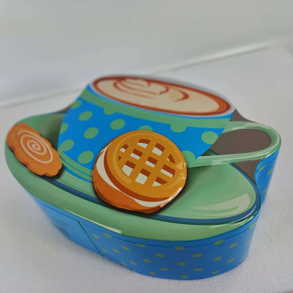 Sjov og anderledes kagedåse, der er udformet som en turkis kaffekop med under tallerken, samt et par småkager.
