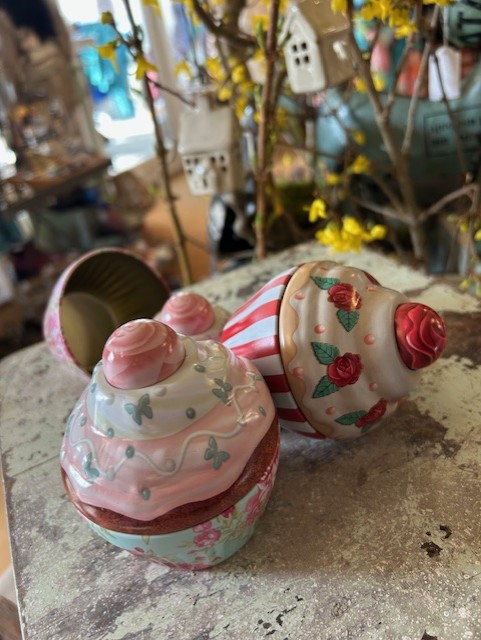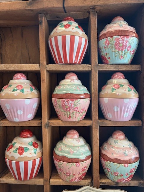 Cup cake dåser med blomstermotiv, striber eller prikker.