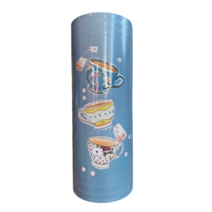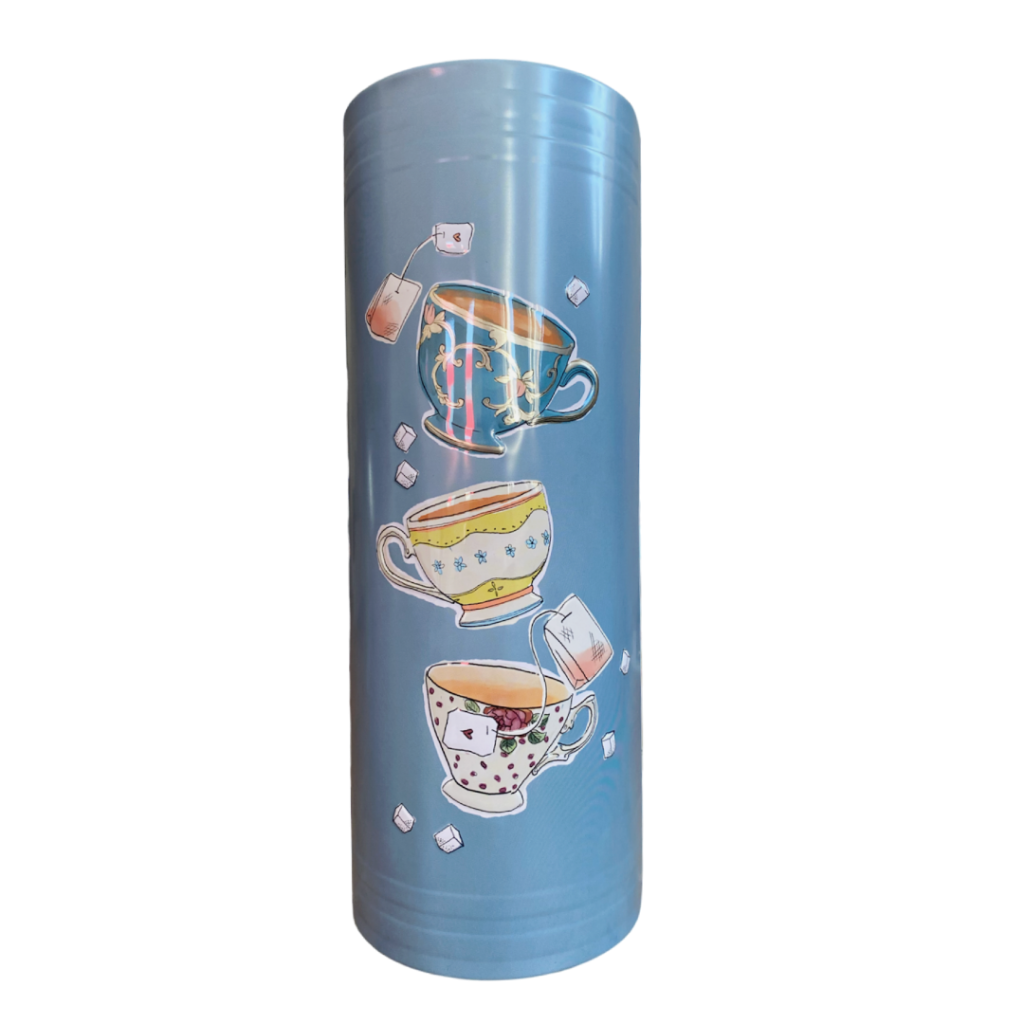 Bogens ryg er i flot blå farve, med forskellige tekopper, og tebreve på.
