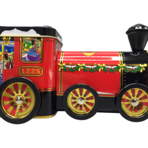 Sød og anderledes kagedåse med Julemanden der kører lokomotivet. Man kan tage låget af i fronten og på toppen.